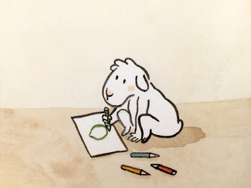 Le protagoniste di questo racconto, sono proprio una classe di graziose pecorelle, illustrate ad acquarello dallo stesso autore Michel Van Zeveren, intente a disegnare.